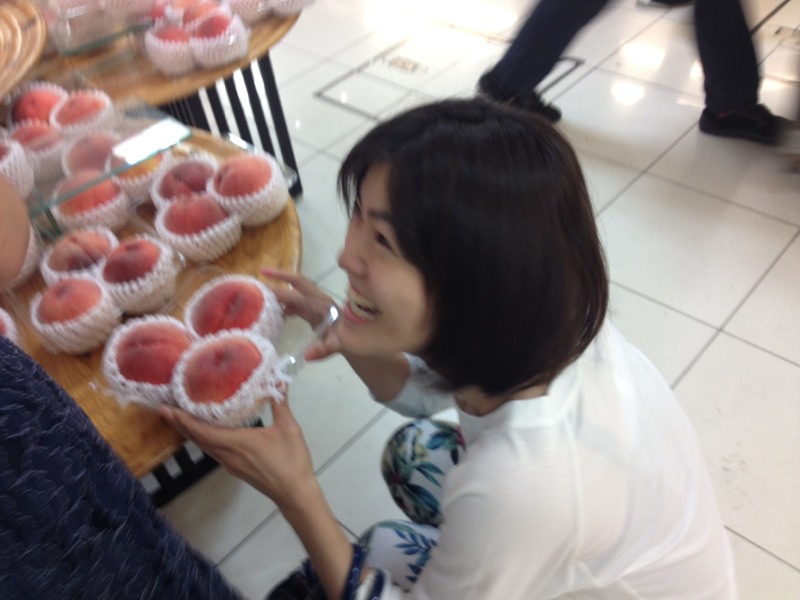 この桃甘いかな〜とにおいを嗅いでいるまーちゃん amagai