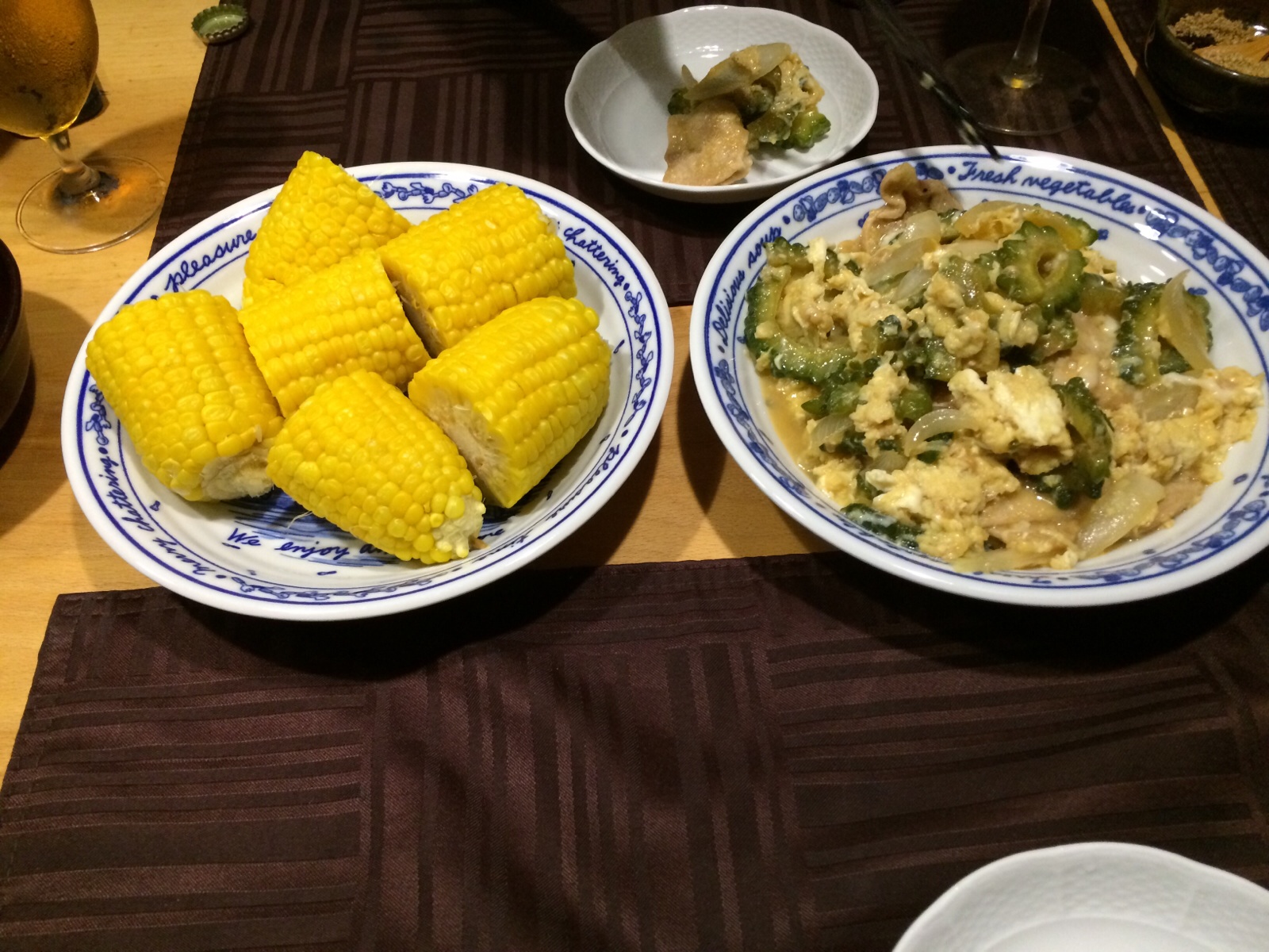 今日のお夕飯は、ゴーヤチャンプルととうもろこしと、素麺です。 ゴーヤは、加藤さん家のお父さまが作ったものです。 感謝します。 ミカエル