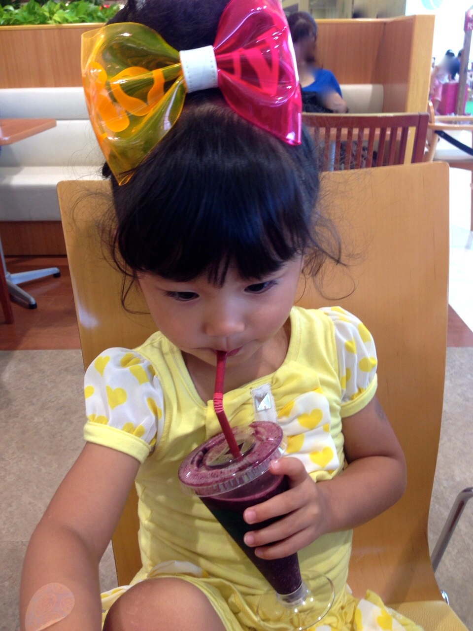 ブルーベリー好きの美梨愛、外でもブルーベリージュース飲んでます♪