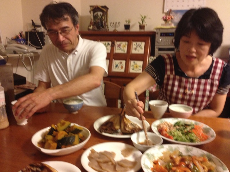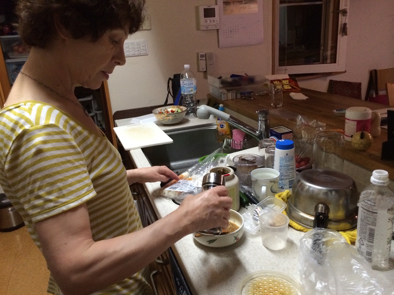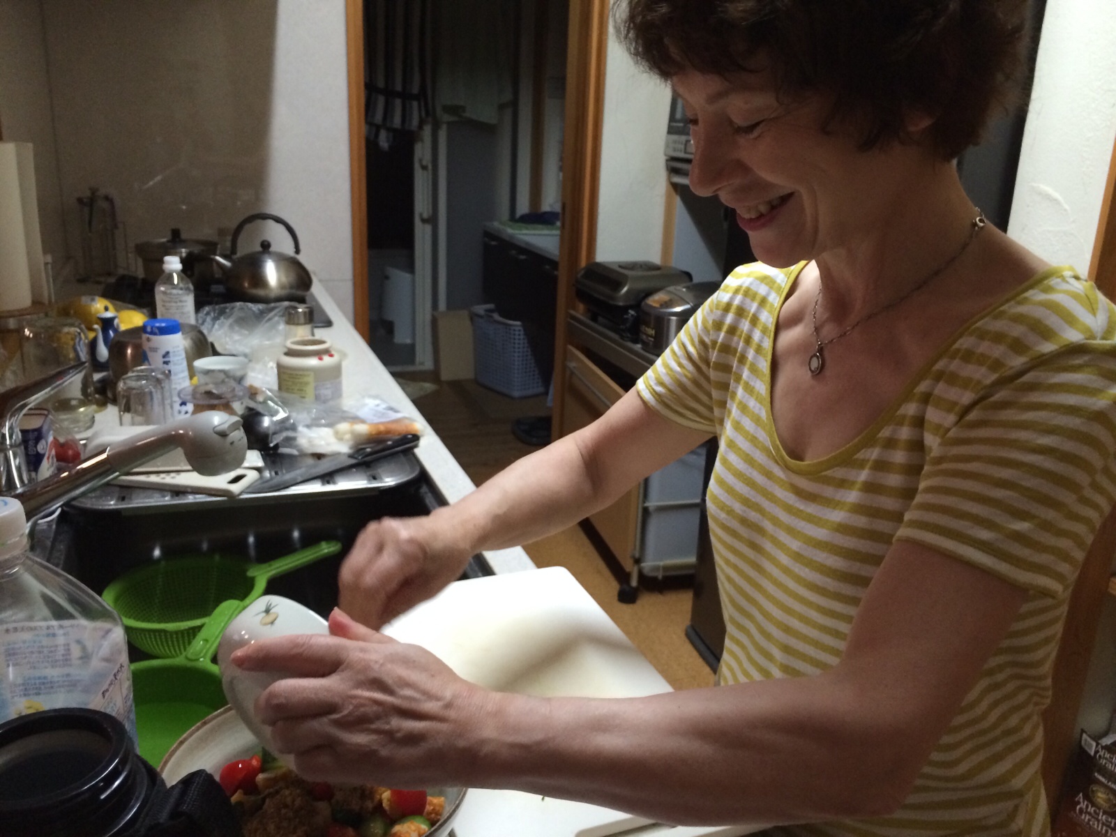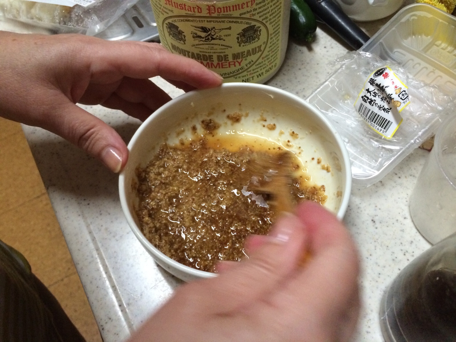 ポメリマスタードと生姜とポン酢でドレッシングを作ってます。 ヨハンナさんが。 ミカエル