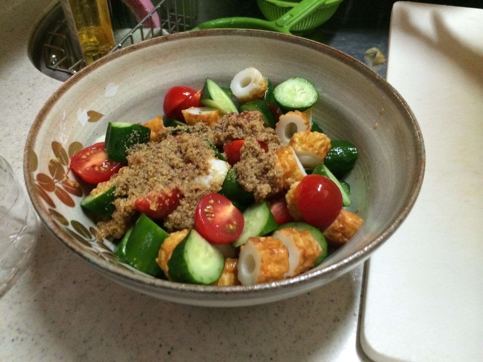 ドレッシングをサラダにかけます。 これを混ぜます。 ミカエル