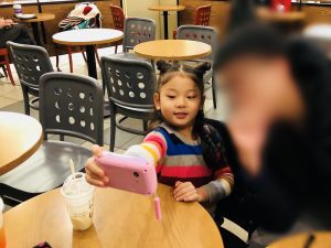 プレゼントでオモチャのスマホをもらってから、よく自撮りしてる幼稚園児w 顔引きすぎて二重アゴになってる w オンライン せいご