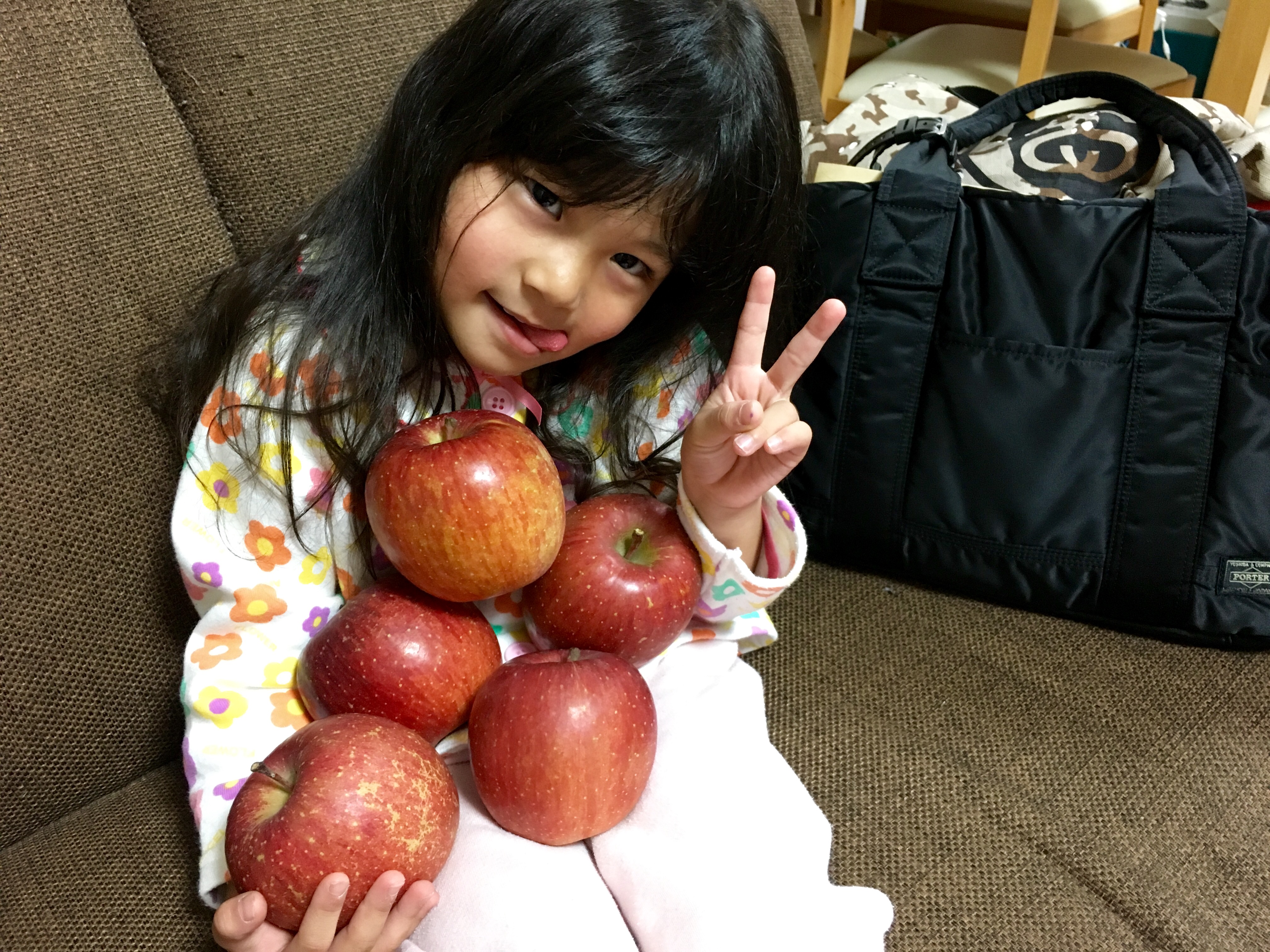 帰宅しました♪ お風呂あがりのミリアと実家からもらったリンゴ! オンラインせいご