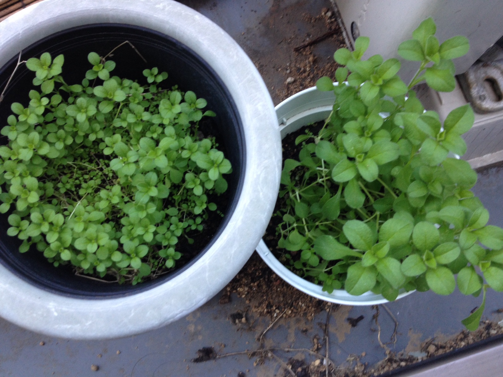 事務所のベランダの何かが枯れた鉢植えにあおあおと草が伸びています。 kato