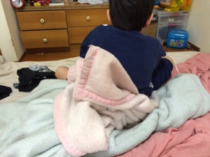 やっと起床。 今日のクリスチャンの寄り道を聴いている息子の背中(^^)