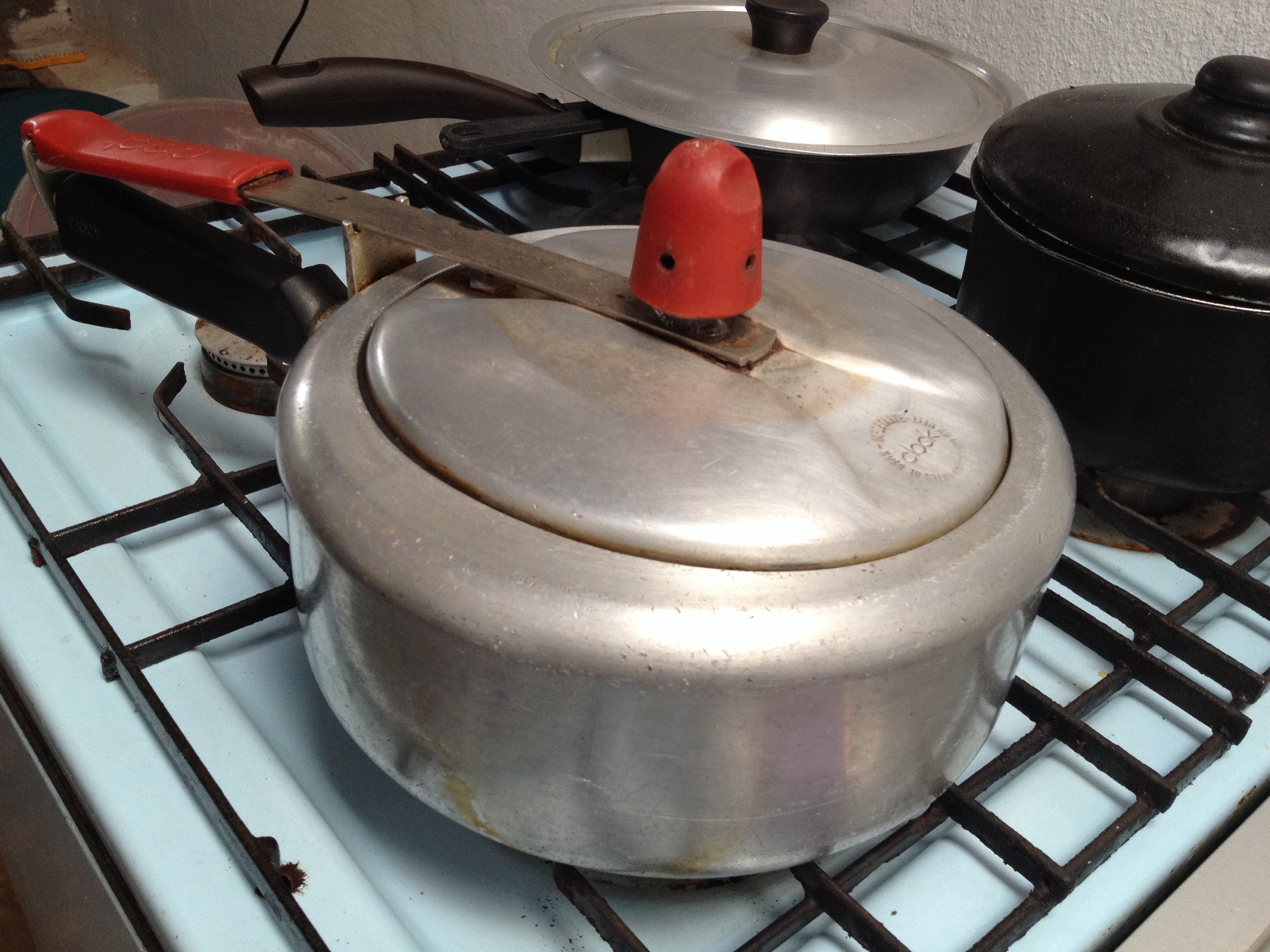 ブラジルに来てすぐ「圧力鍋が爆発した」という話を聞いて、いまだにおっかなびっくり(^^) 赤い部分に穴があり蒸気が出るので、詰まらないように…。考えると原始的ですが、便利です。