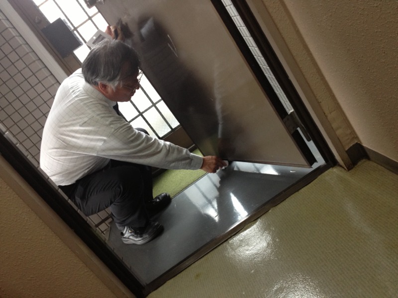 9月1日の避難訓練に向けて、ストッパー確認をしました。エレベーター隣の階段ドアはOK!です。
