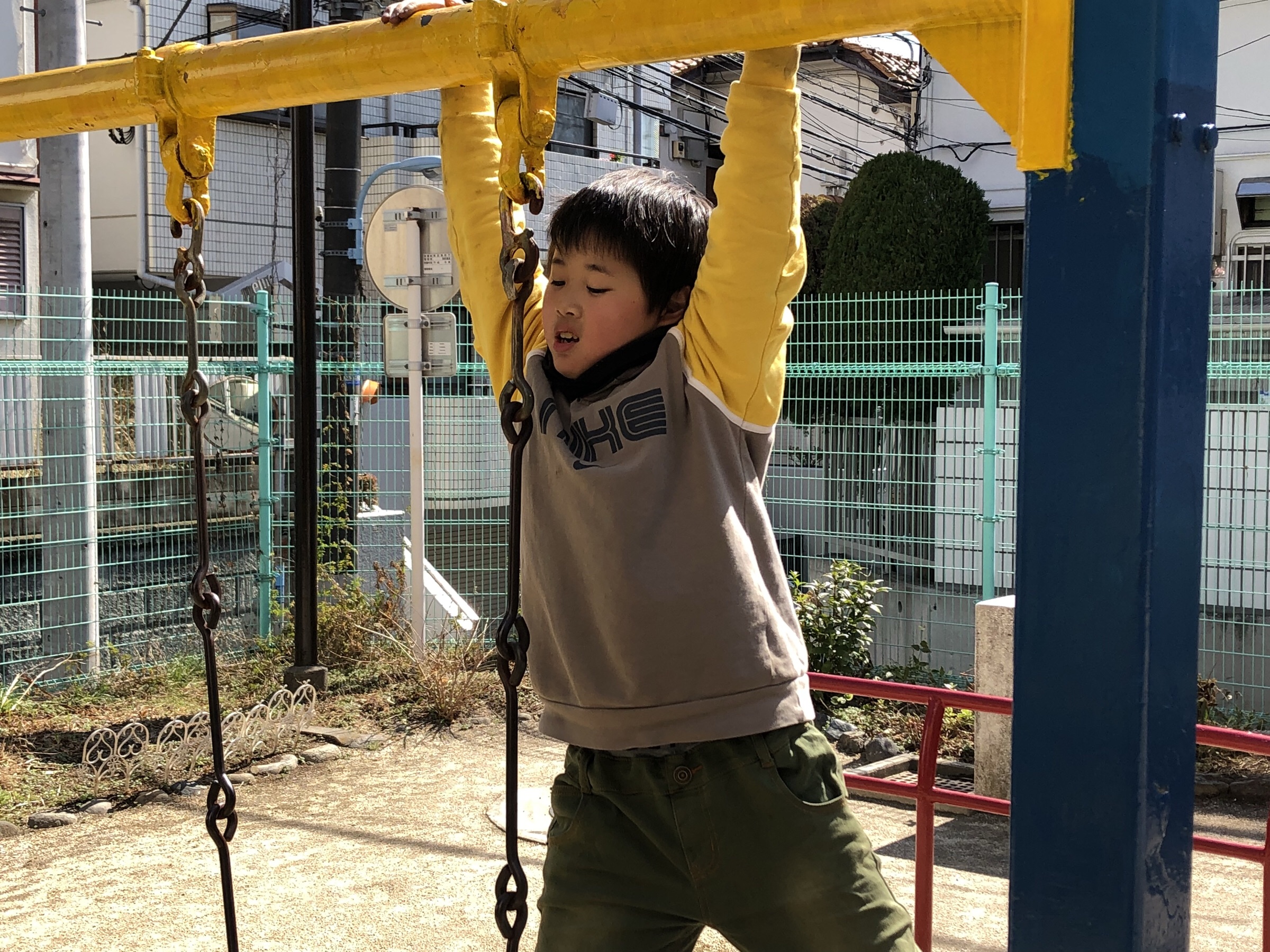 ブランコの上の棒でうんていしてます