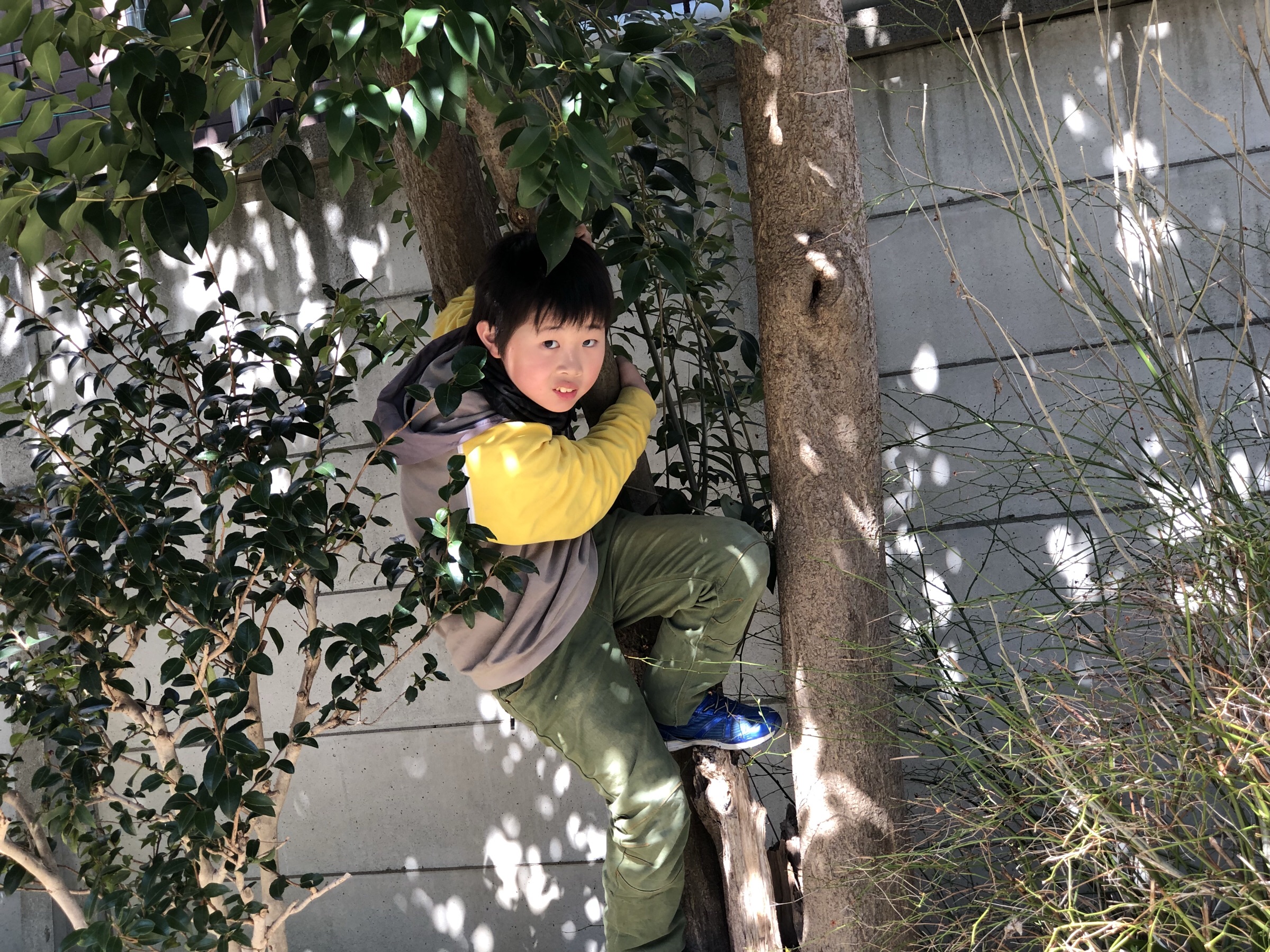 火曜礼拝の後公園で木登りしてます