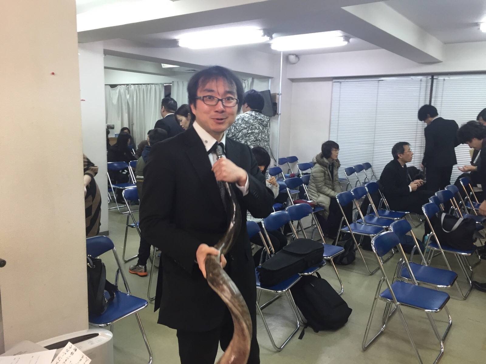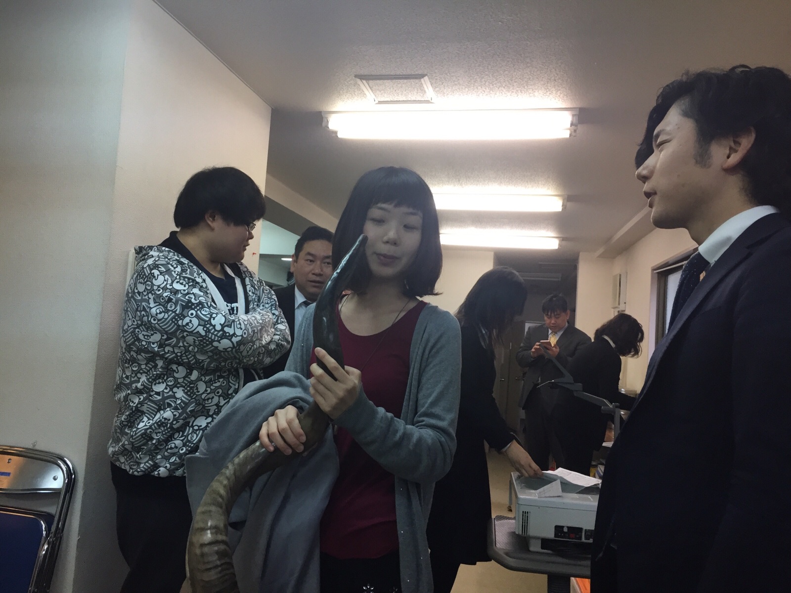 リポーターりょうこちゃん、角笛に挑戦しています。masukawa