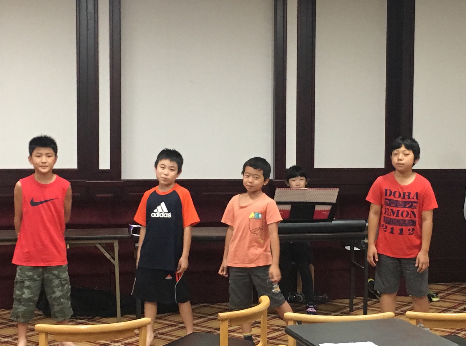 リハーサル後の練習室での一枚ならありました〜(^^;) 合わせたわけではないのですが、男の子たちはみんな赤っぽい服でシオンちゃんの楽譜入れも赤。 不思議な一致感にほんわかしました☆ 子供キブツ サム&まえダビ母