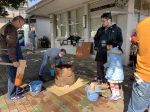 今日は新年子供のお楽しみ会。朝から晴れ渡り、管理室の方から準備に勤しむ賑やかな声が聞こえて、行って見ると、子供たちはゲームに興じ、大人たちは、米を蒸し、もちをつき、こねて売り、買う人が行列を作っていました。