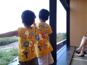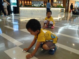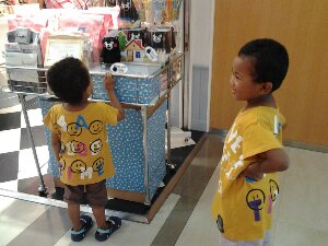 二人はミニカーで広いフロアーを見つけて遊んでいます。