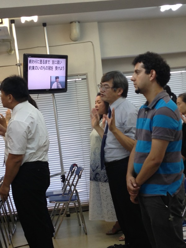 中部地区の長老であるペテロ窪田牧師、イスラエルのシャイさんのお隣で賛美されています。